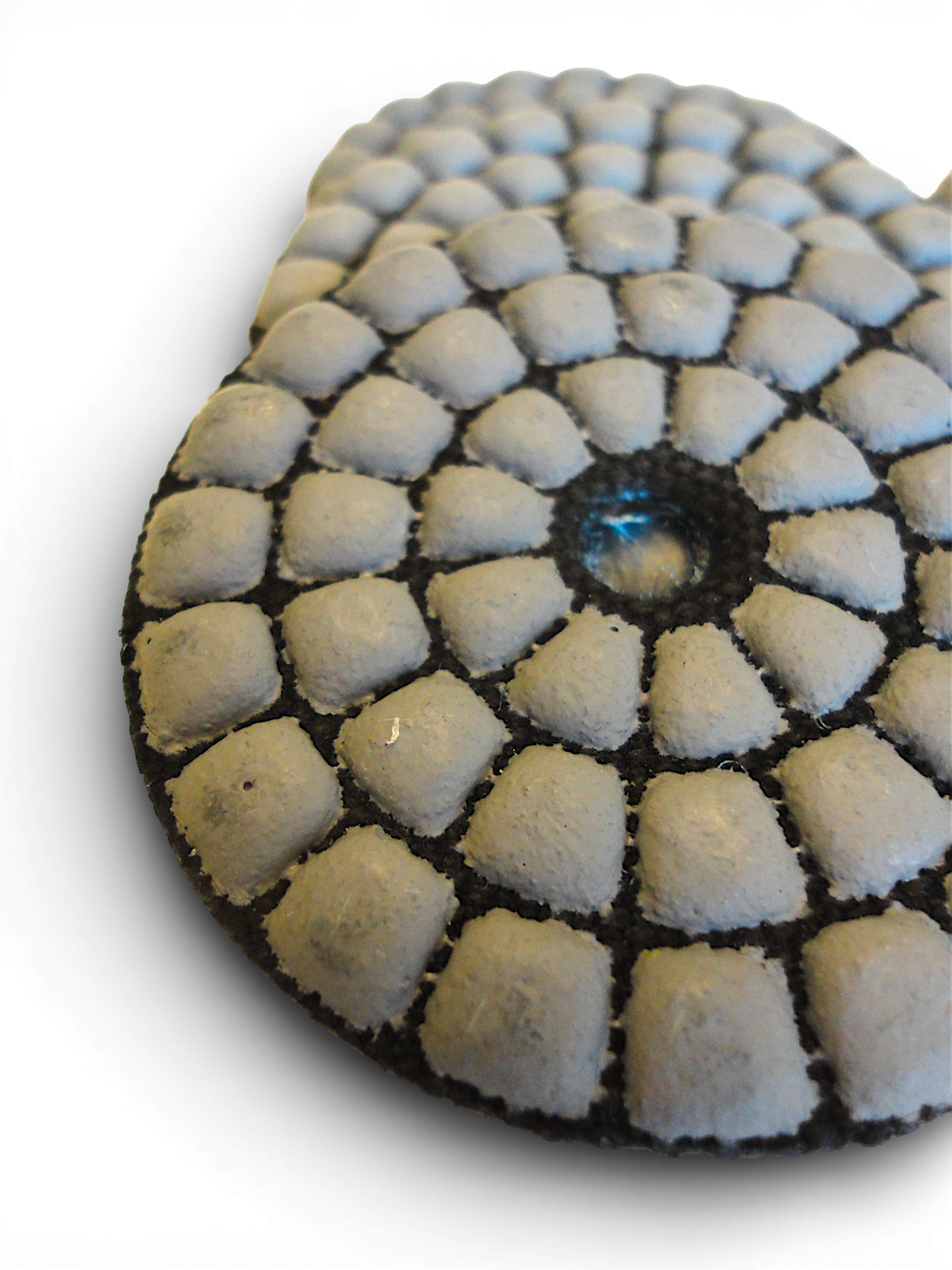 Применяется для сухой, мокрой шлифовки и полировки изделий из искусственного и натурального камня, керамики, стекла. Изготовлен на гибкой основе, имеет алмазное напыление толщиной 2 мм. Крепеж липучка VELCRO. Специальная сотовая структура расположения алмазного слоя (она же «черепашка») позволяет эффективно выводить выводит частицы материала из зоны обработки, что снижает перегрев и облегчает сухое шлифование.